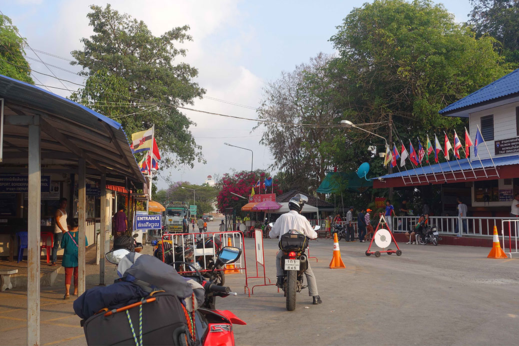 Retour au bureau de douane avec les 25 photocopies (véridique). Elle classe ce paquet de documents sans même vérifier la véracité des photocops. La photocopie de l’acte de naissance de ma grand-mère maternelle aurait eu le même effet. Peu importe, on a gagné le droit de jouer au deuxième bureau. La rebelote mêmes papiers mêmes explications mais on a gagné un tampon et le droit de jouer au bureau suivant. Je vous passe les détails du bureau 3 mais c’est pareil. Bureau 4 la cela semble plus sérieux. Dévisagement, prise de photos, suspicion et enfin on reçoit un bout de papier cartonné et plastifié rose qui signifie que l’on peut passer la frontière thailandaise. Nous enfourchons les motos pour faire 20 mètres et là déception totale. voila que cela recommence. papiers de la moto, passeport, papiers du conducteur etc.. Une demi-heure après nous obtenons un laissez- passer pour aller jouer un peu plus loin. Nous passons chez l’ennemi, le cambodgien.