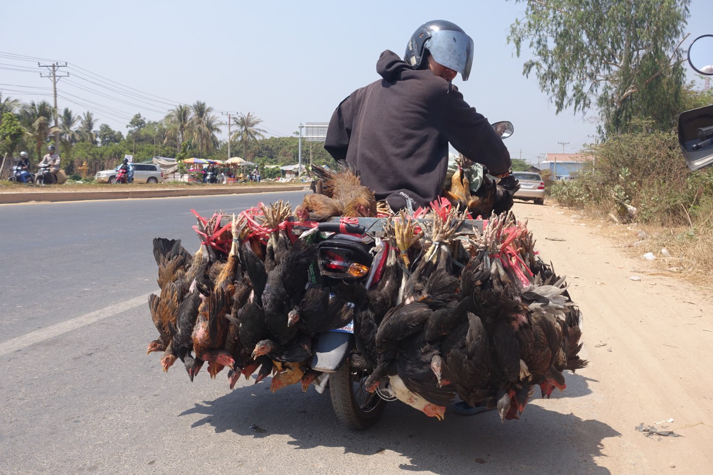 Quelques images prises sur le chemin : maisons traditionnelles, livreur de poules, code de la route des vaches, magie de la nature dès qu’il y a un peu d’eau et signalisation des routes secondaires….